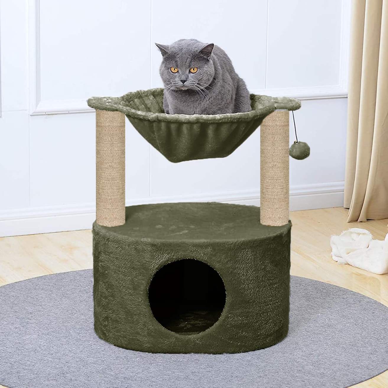 Crafted with premium, pet-safe materials, this multi-level cat tree features a cozy elevated cat bed for lounging and napping, plus a soft, breathable hammock that cradles your feline in total comfort. The reinforced sisal scratching post supports healthy claw maintenance while protecting your furniture from unwanted scratching. Its strong, stable base ensures wobble-free play, making it ideal for kittens, small cats, and even medium-sized breeds.