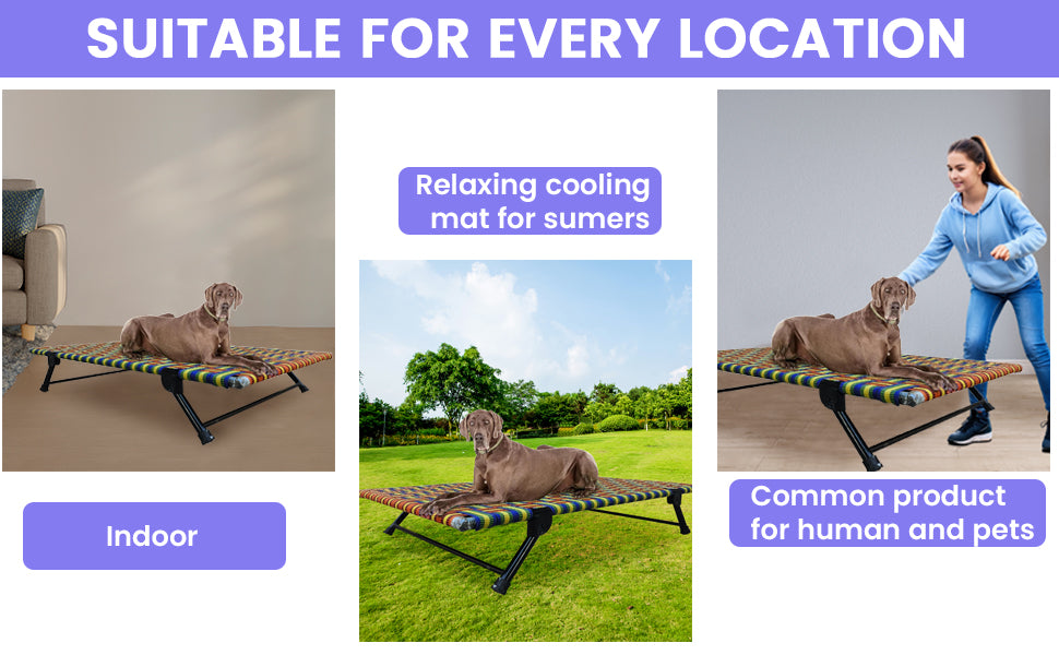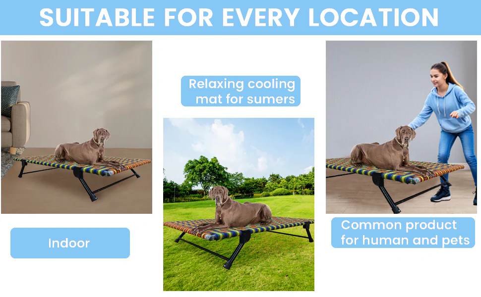 This dog bed is suitable for use in any setting, including the living room, garden, balcony, or on the go. It is lightweight, collapsible, and weather-resistant, ensuring comfort and convenience wherever your pet rests or plays.