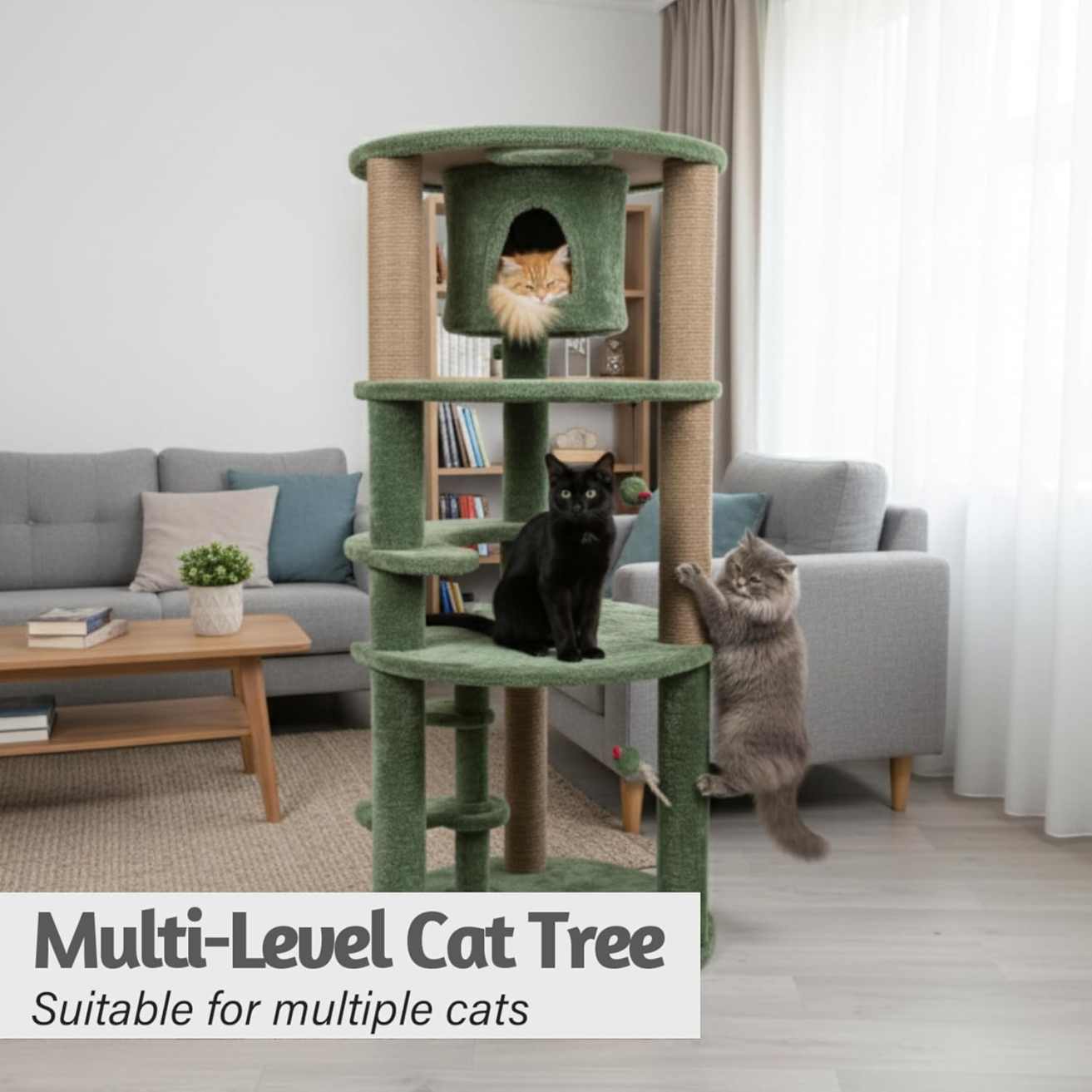 Give your cat the ultimate indoor playground with the Multi-Level Cat Tree with Condo, Scratching Posts, and Plush Platforms (Grey & Natural – FURR-87-GR, Green). Designed for kittens and adult cats, this cat tree combines climbing, scratching, and lounging in one stylish and functional unit.