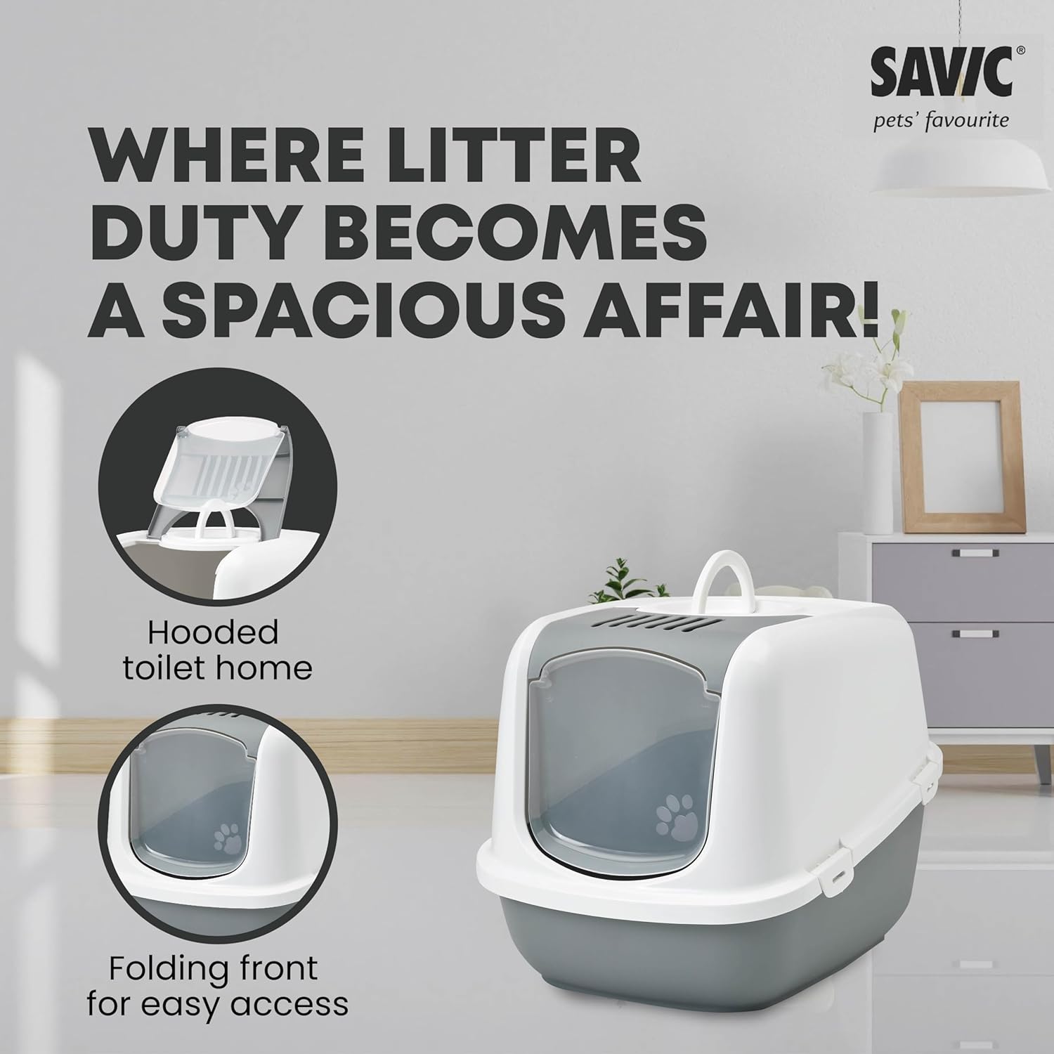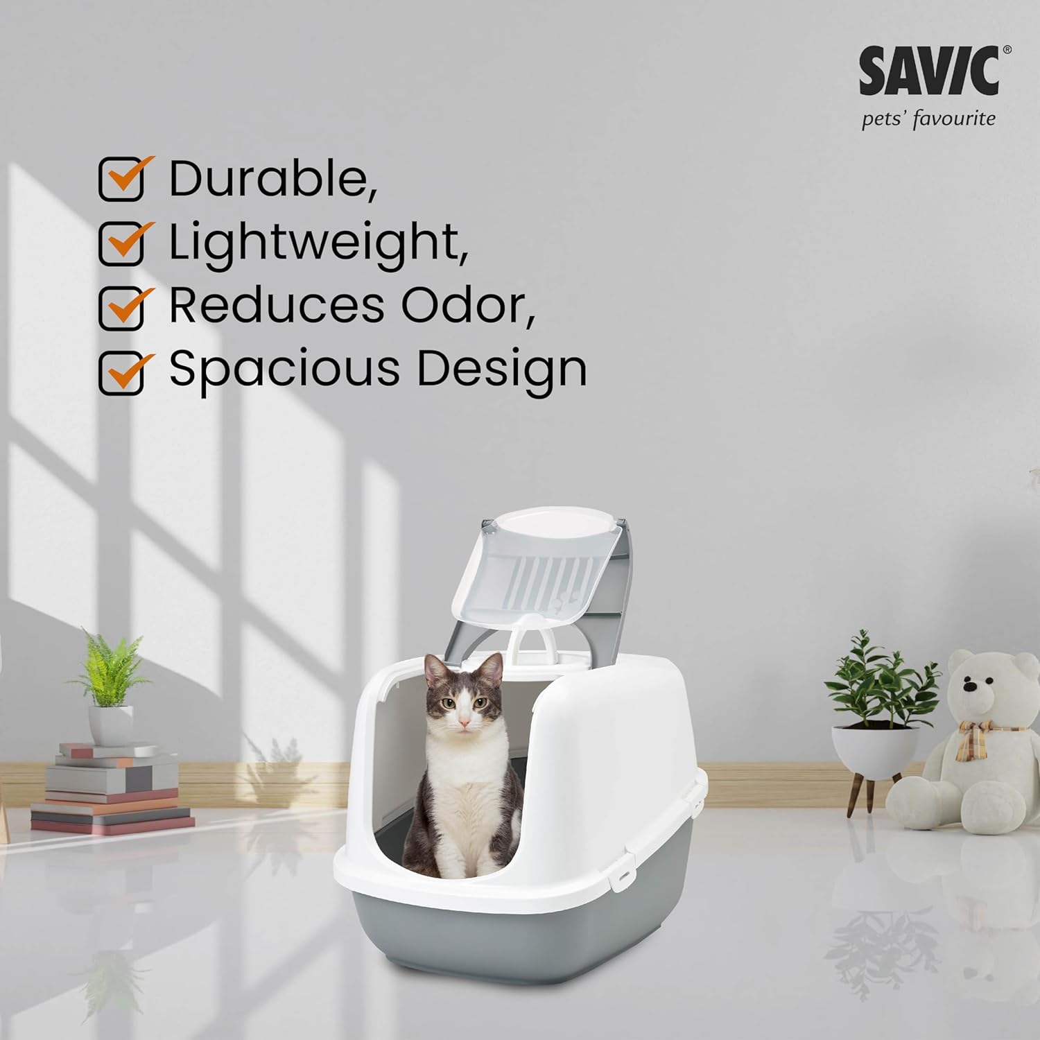 Built with durable yet lightweight materials, this jumbo litter box is made for daily use and long-term reliability. The raised back helps contain messes, while the replaceable carbon filter efficiently absorbs unpleasant odors, keeping your home fresh.