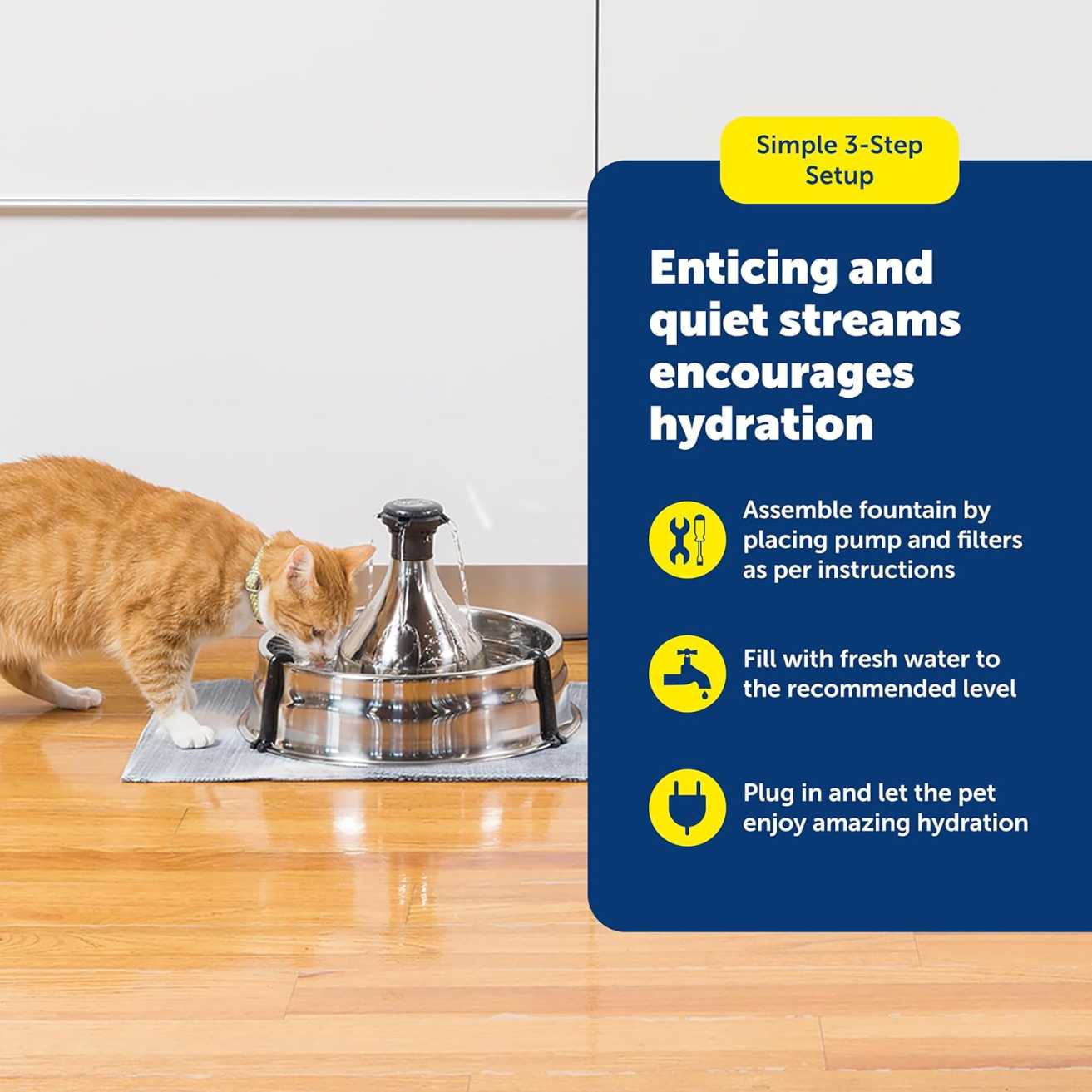 Made from durable, scratch- and rust-resistant stainless steel, this fountain is built to last and stay clean for years. The automatic water circulation system keeps water fresh and oxygenated, while the built-in filter removes hair, debris, and odours, providing clean and safe water for your furry friends.